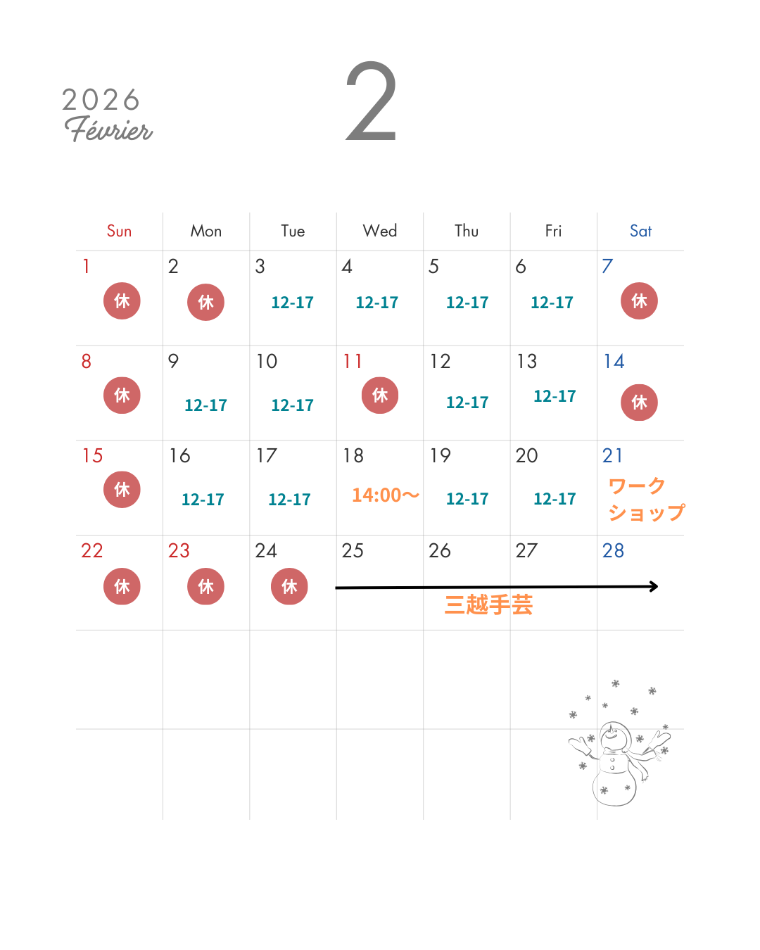 ◆今月の営業カレンダー◆