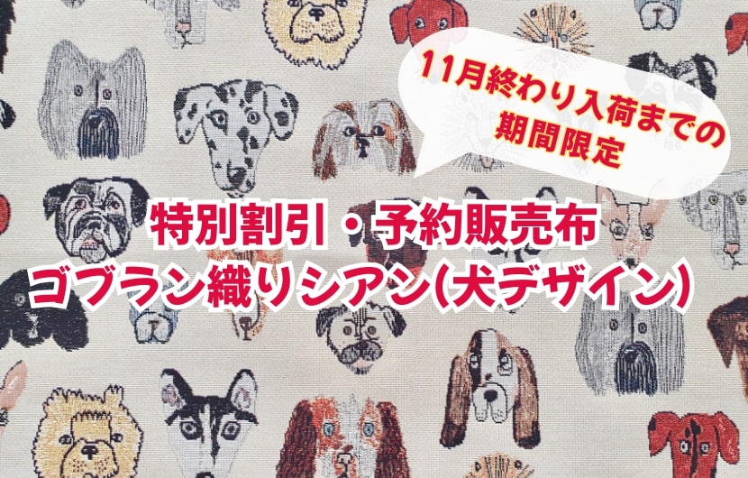 大人気の犬デザインゴブラン織り生地↓を特別割引価格にて予約注文受付中です!