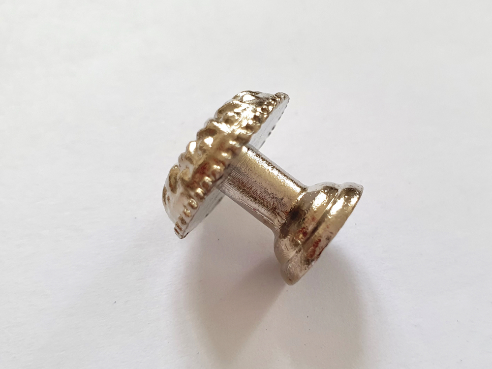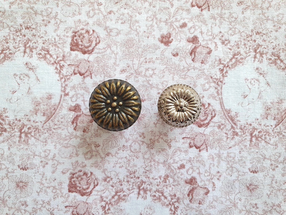 *製造状況によって若干写真と違う部分があることがありますことをご了承ください。商品重量数量1につき15gサイズ直径約1.8cm、高さ約1.5cmシルバー色の円形花模様の取っ手です。カルトナージュ作品や…