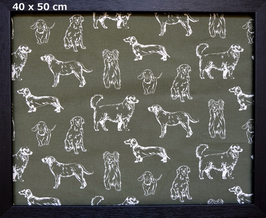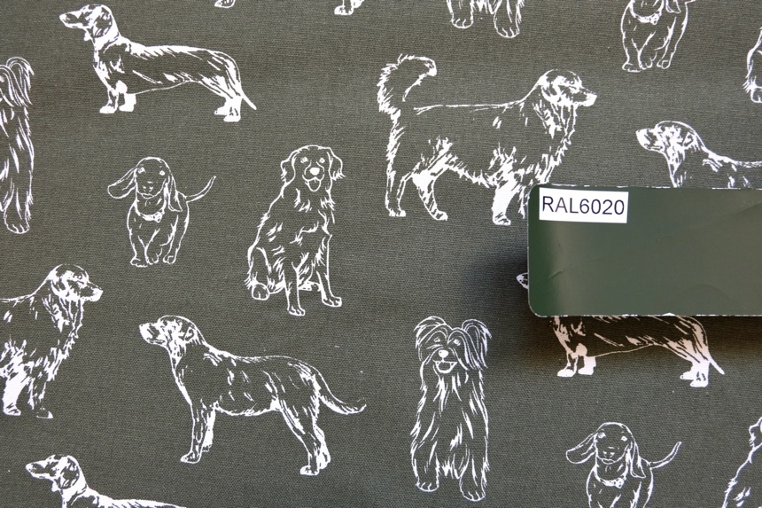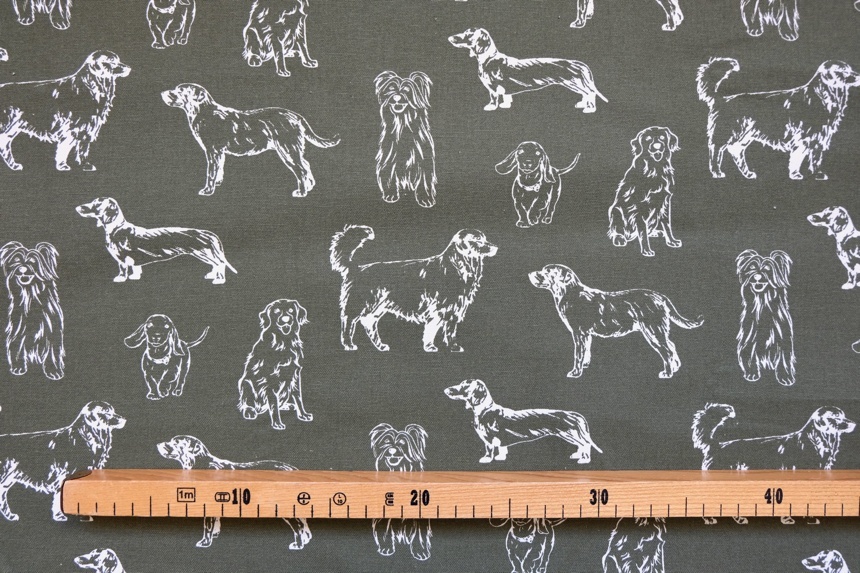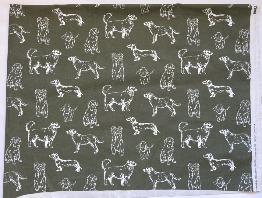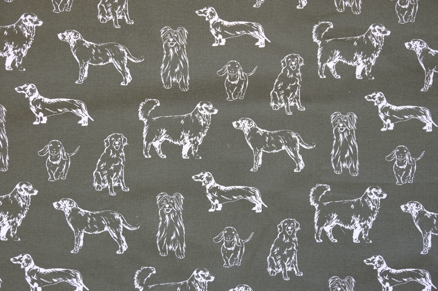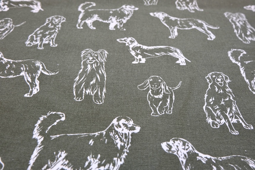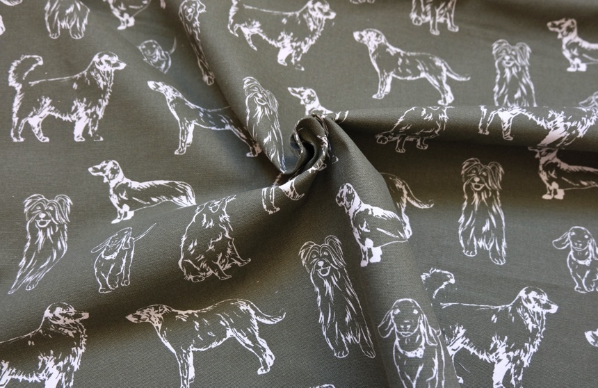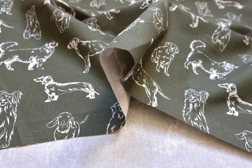 モスグリーンベースにいろんな種類の犬がデザインされた生地です。