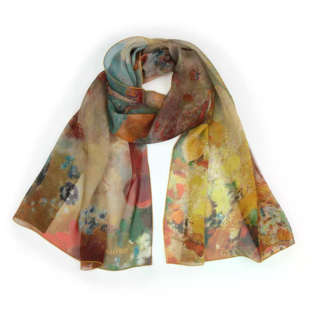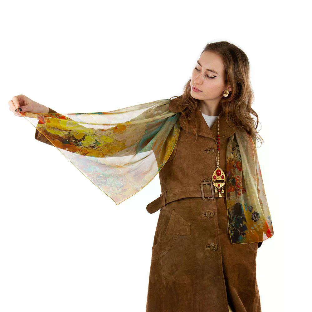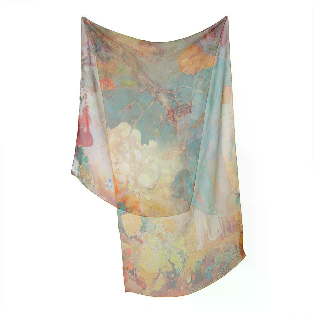 このシルクシフォンスカーフは、フランス象徴主義の画家オディロン・ルドンのパンドラを描いた2点の絵画の複製です。