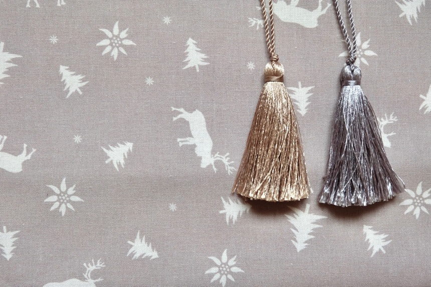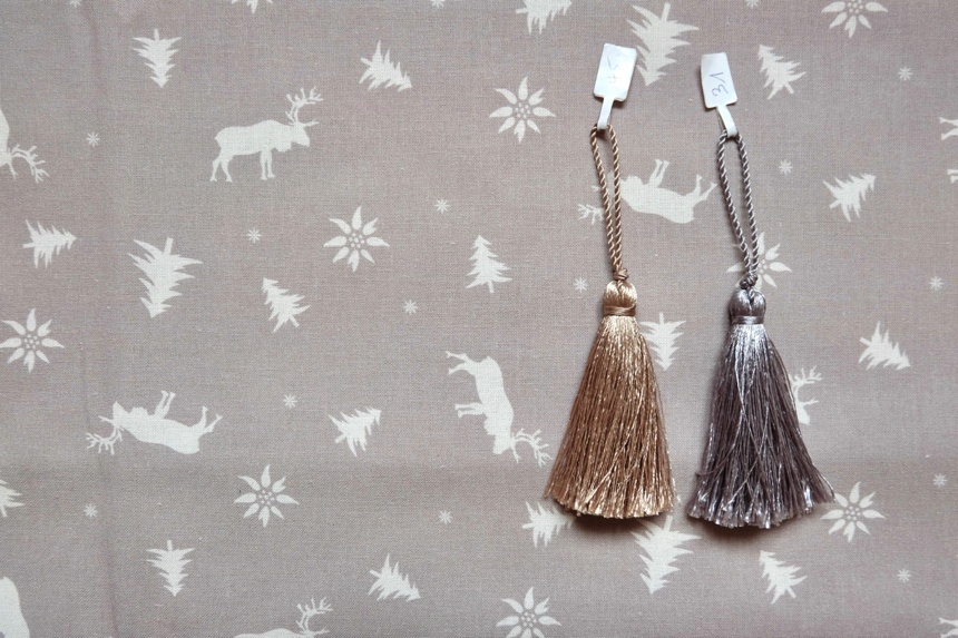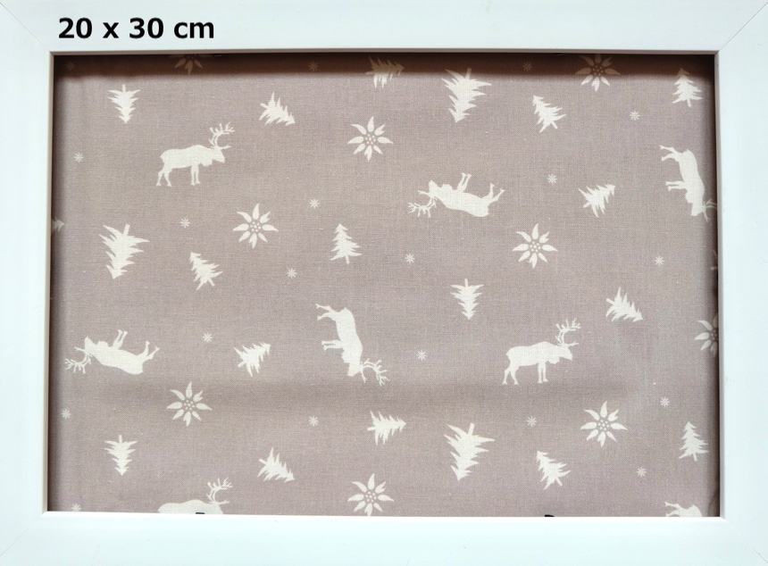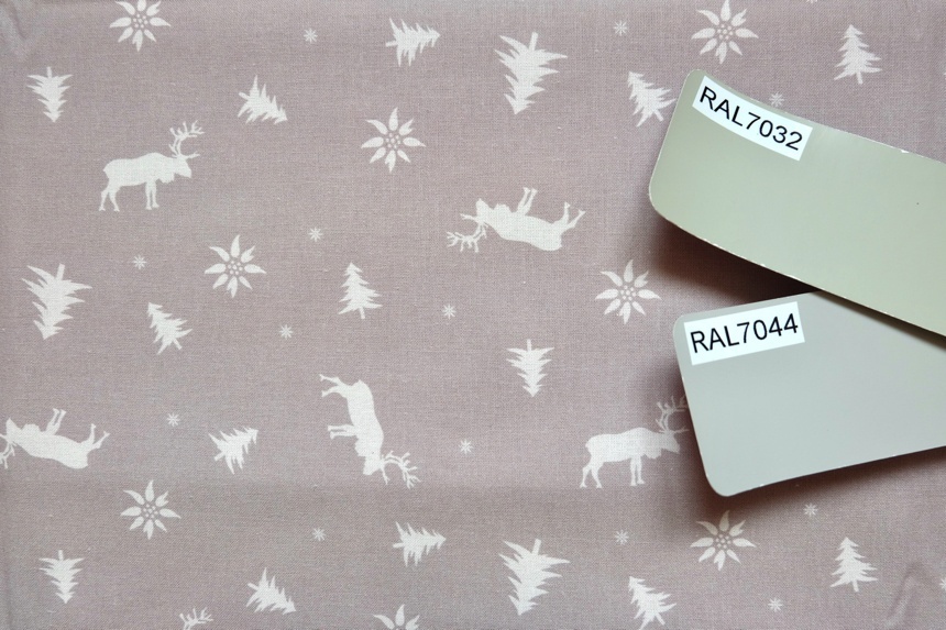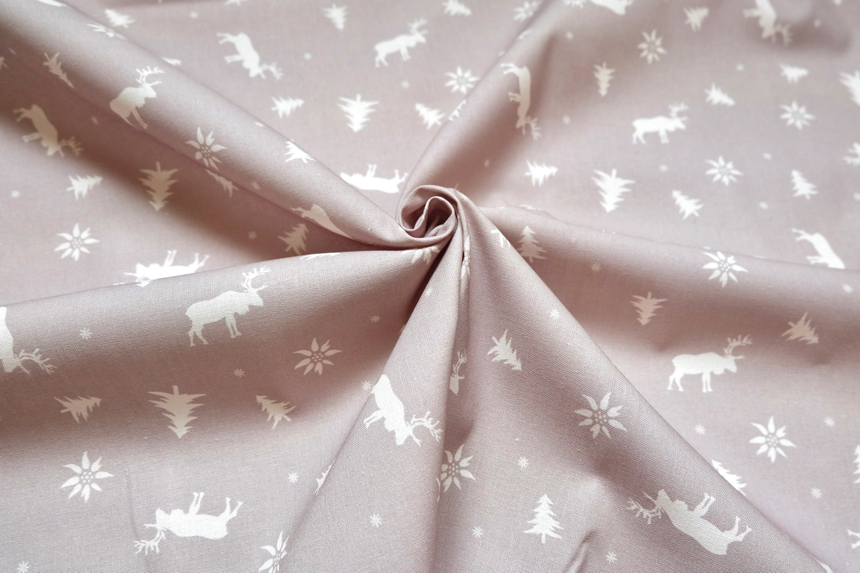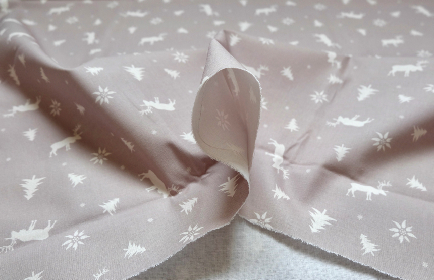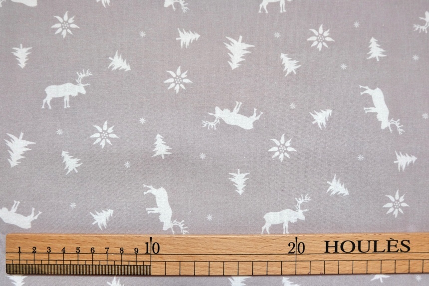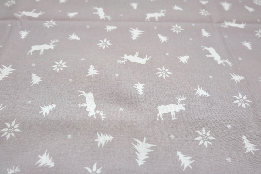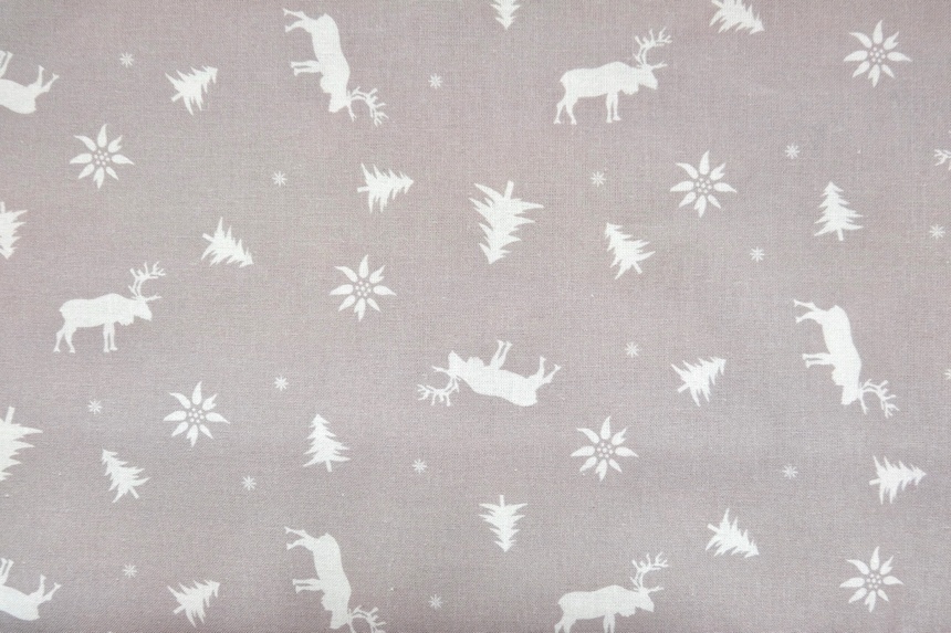 グレージュベースに白でトナカイとエーデルワイス、もみの木が描かれたデザインです