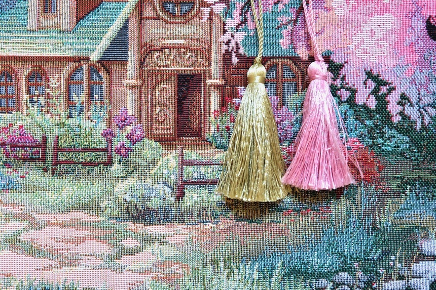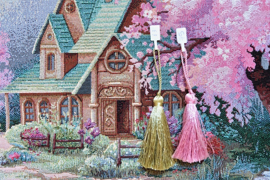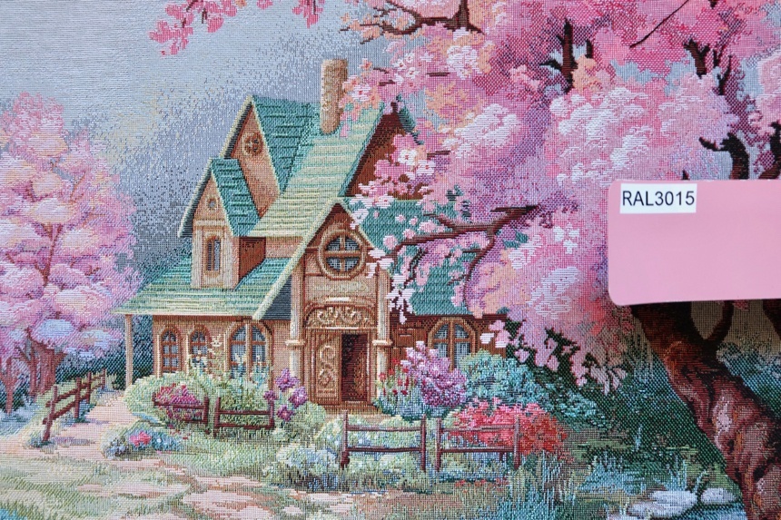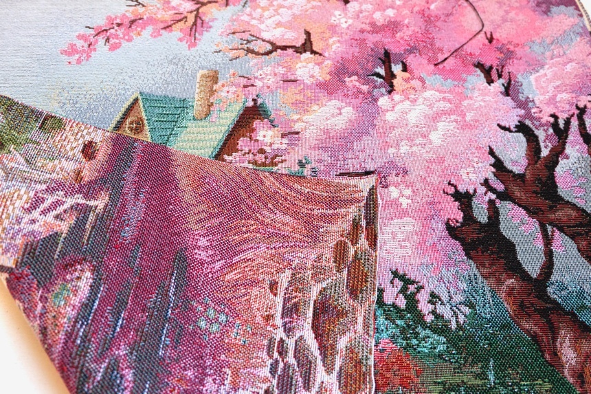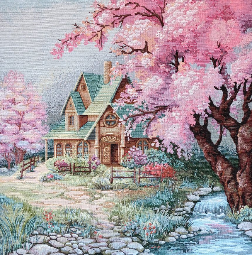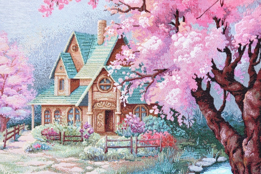 童話に出てきそうな家とピンク色の花を咲かせた木が幻想的にデザインされています。