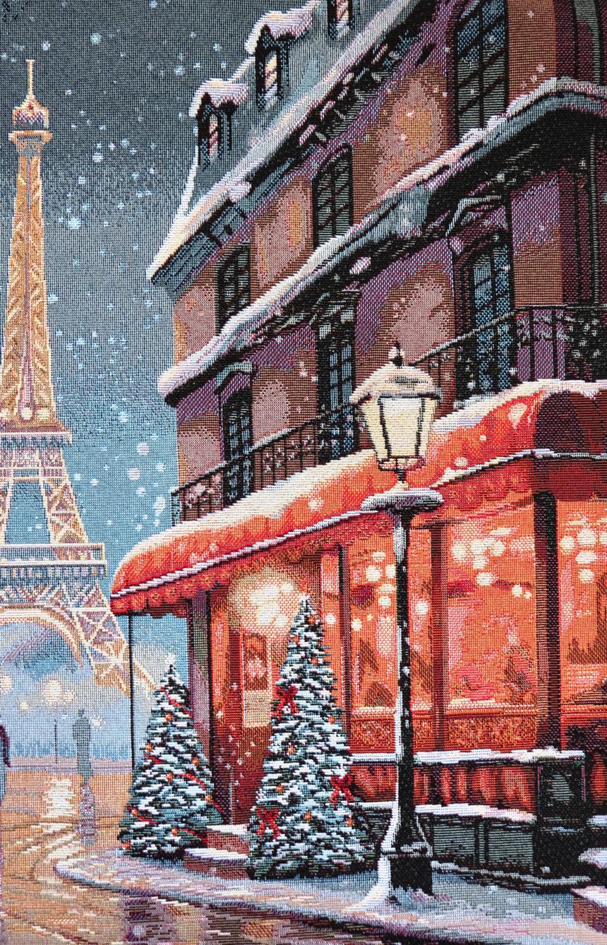 雪の降るクリスマス時期のパリの建物、エッフェル塔、クリスマスツリーがデザインされています。