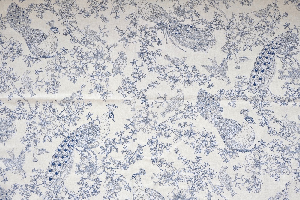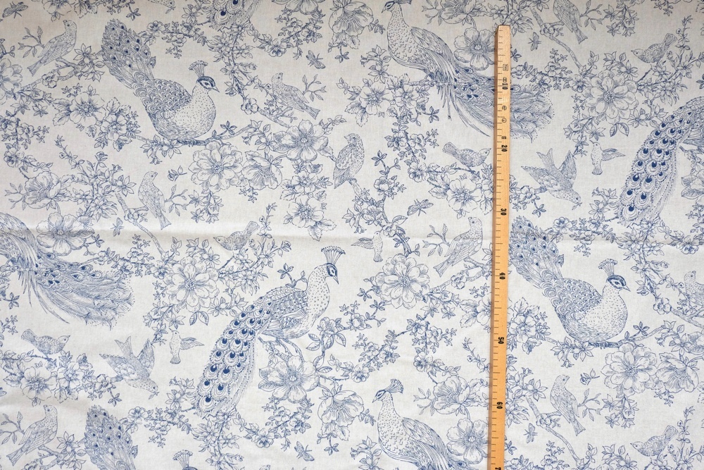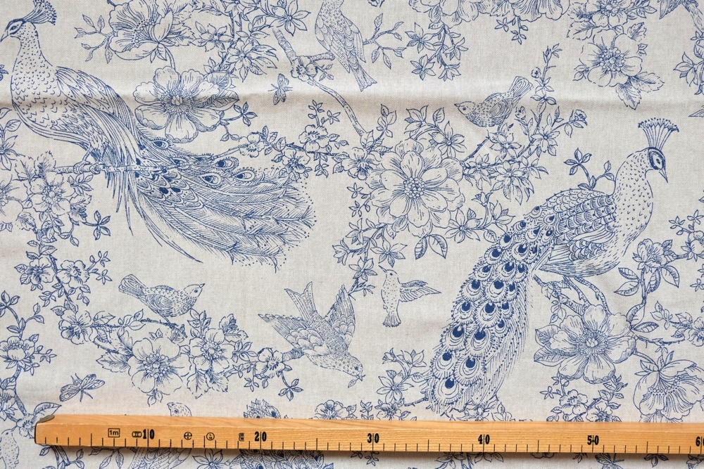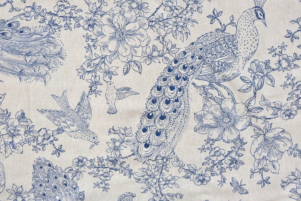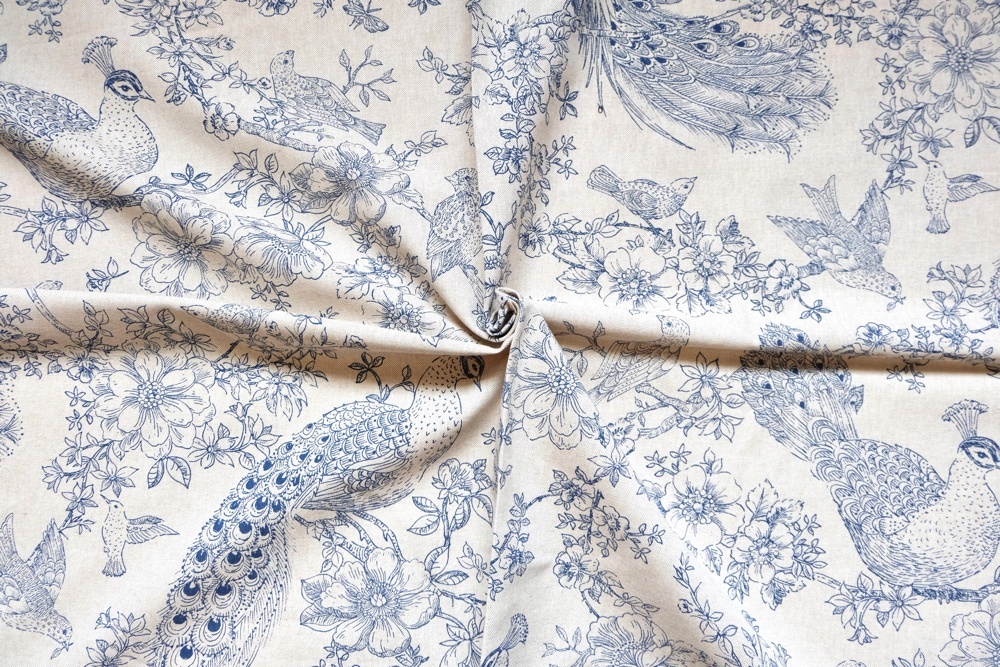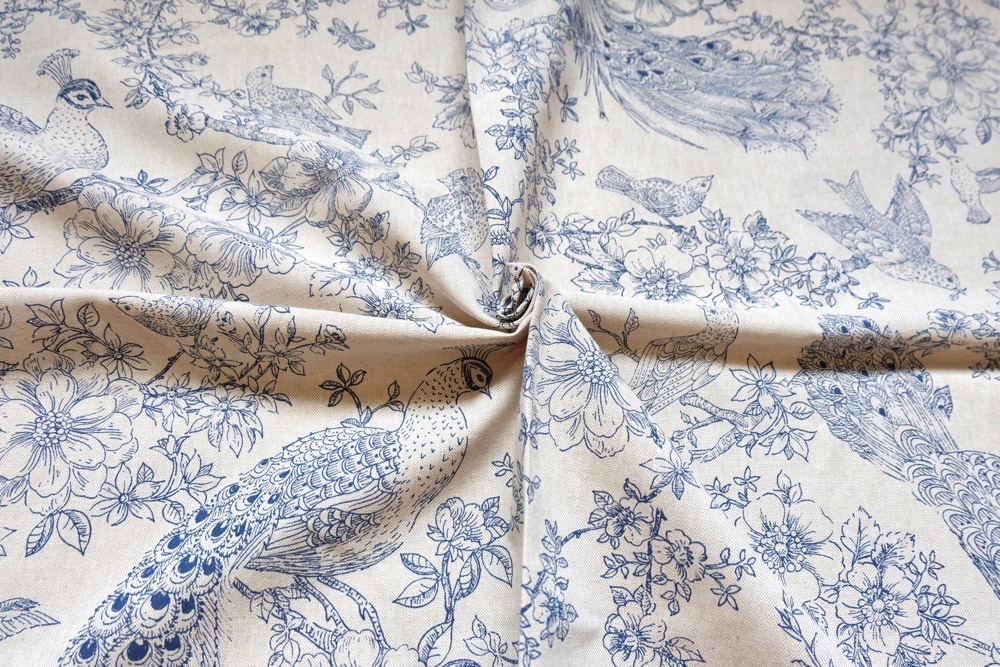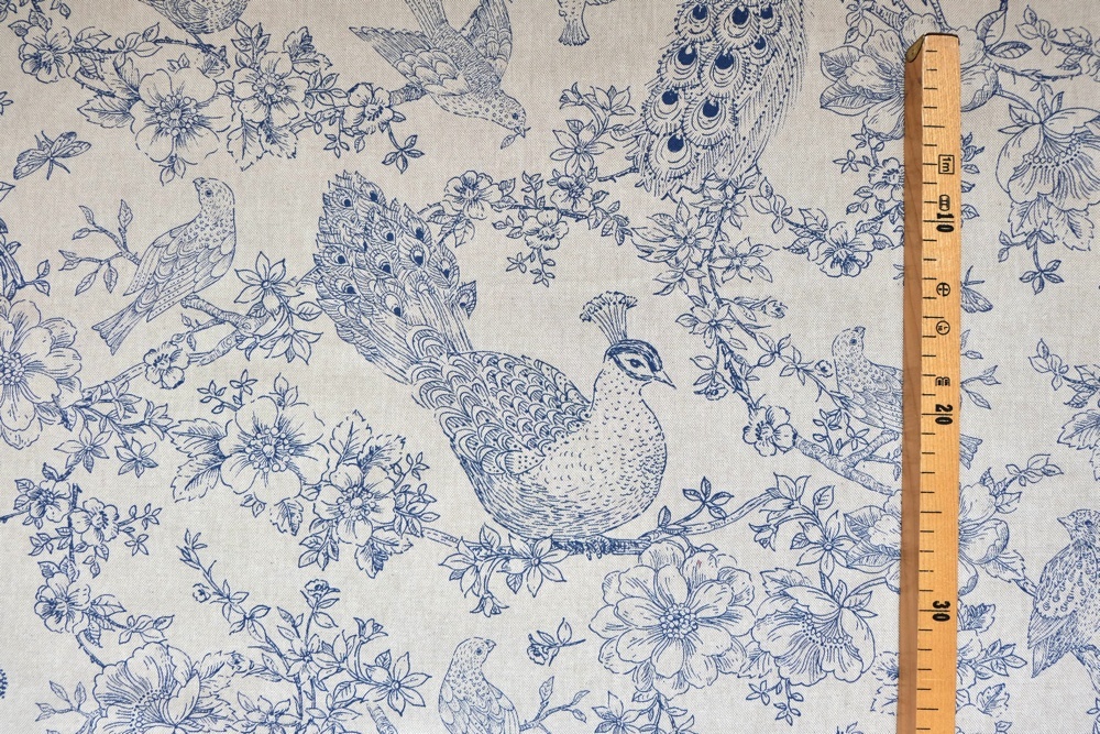 麻風のベージュ色の生地にブルーでクジャクや小鳥、花がデザインされた生地です。