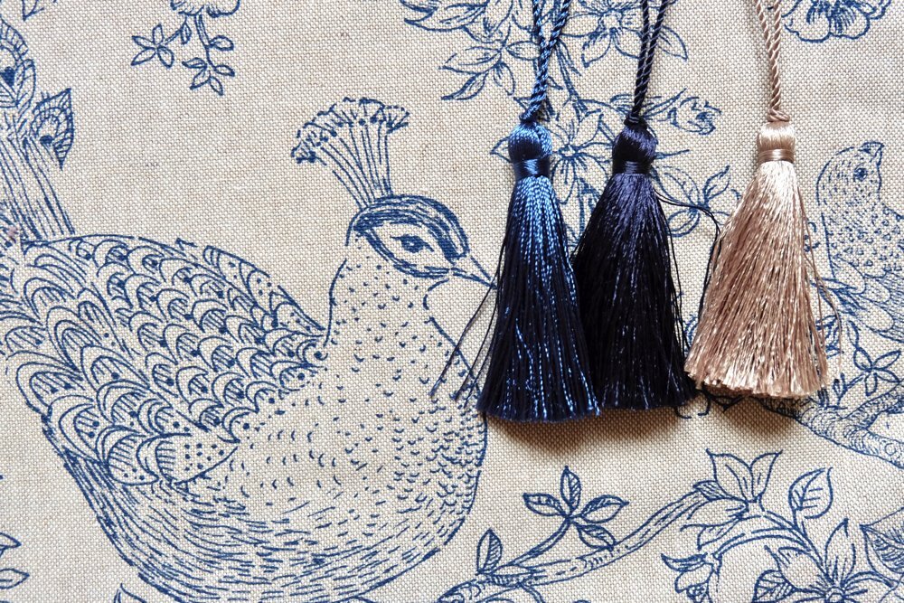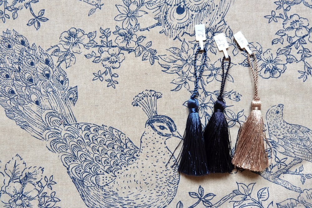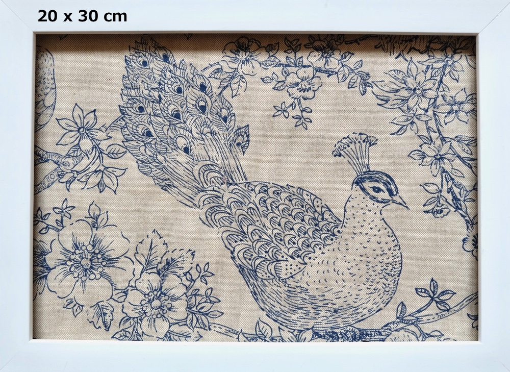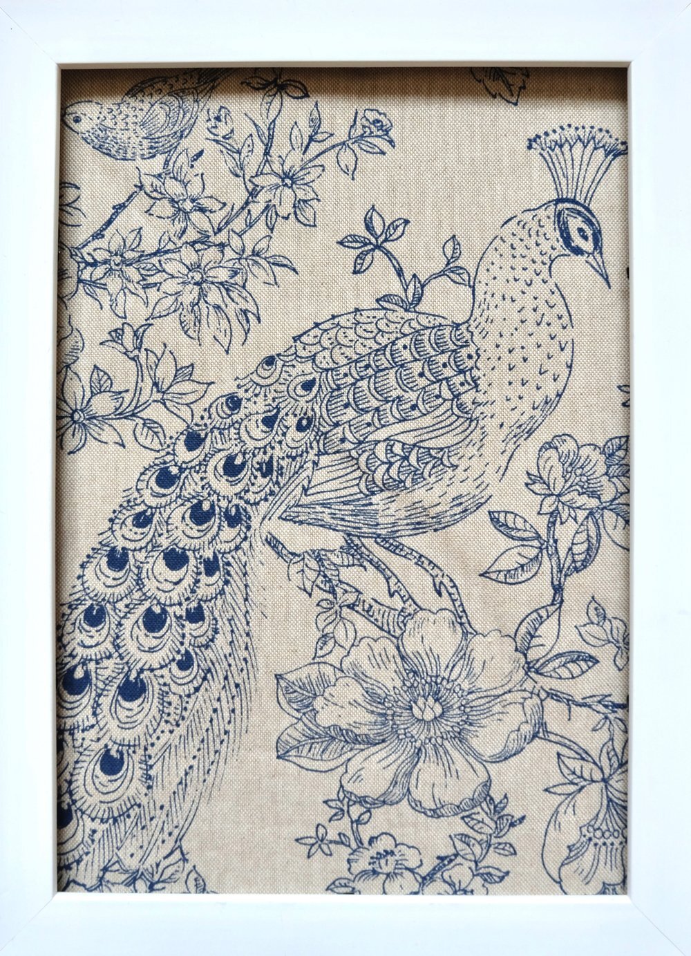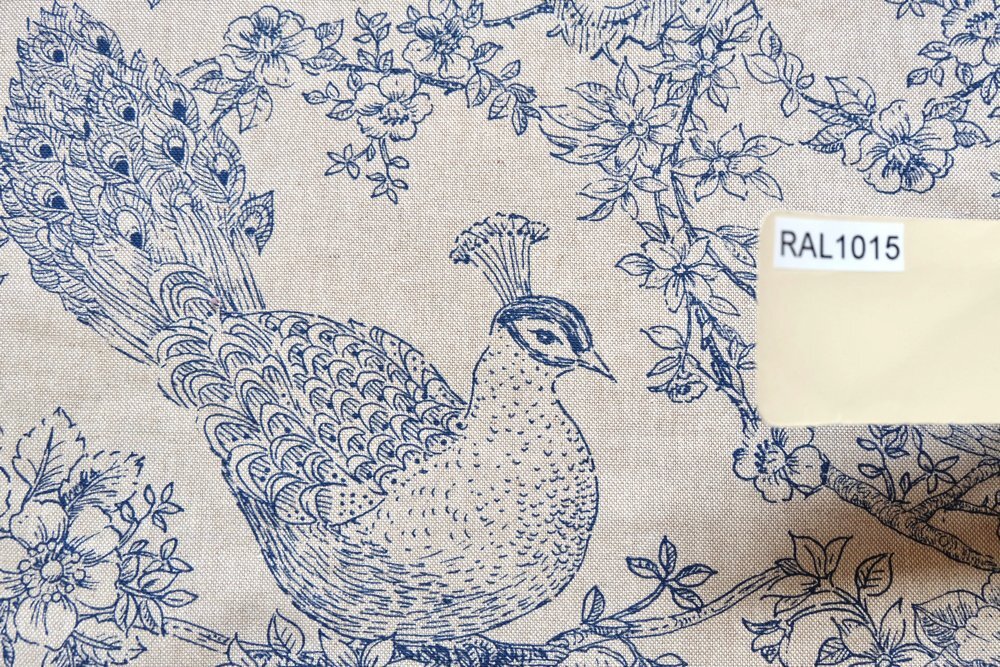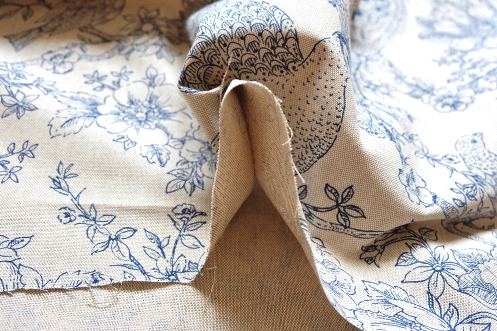 麻風のベージュ色の生地にブルーでクジャクや小鳥、花がデザインされた生地です。