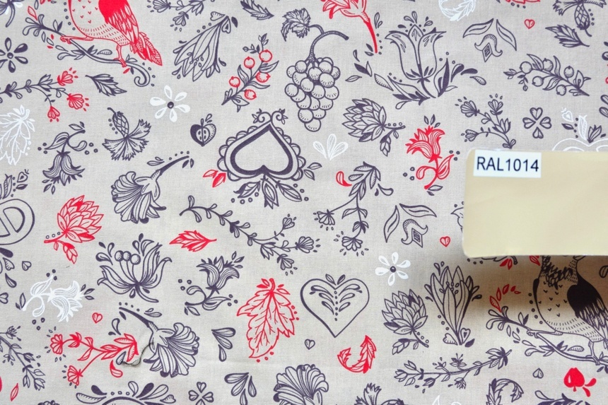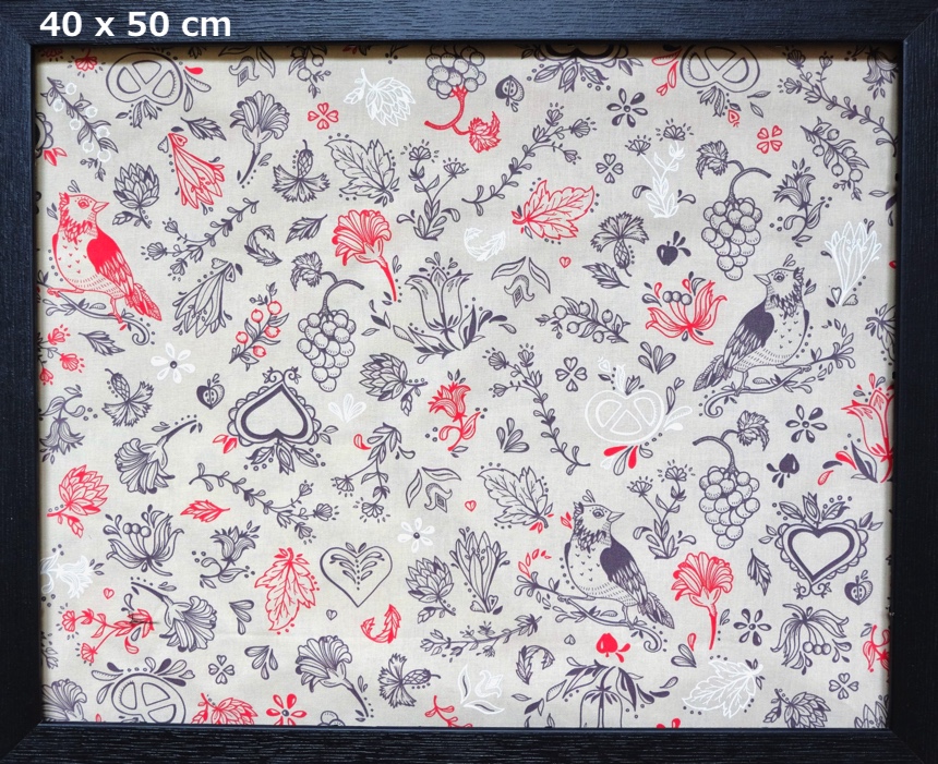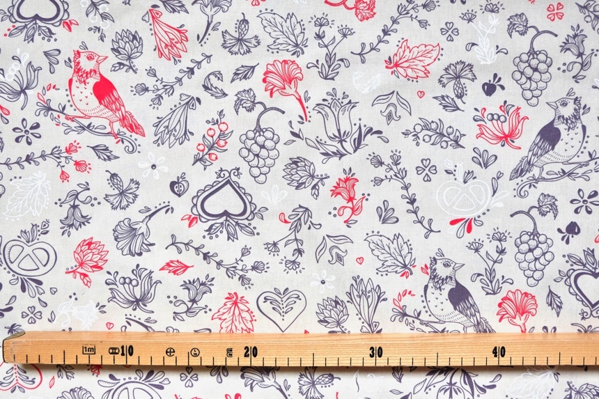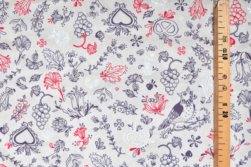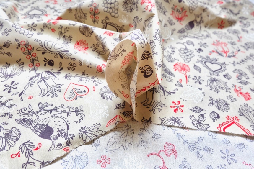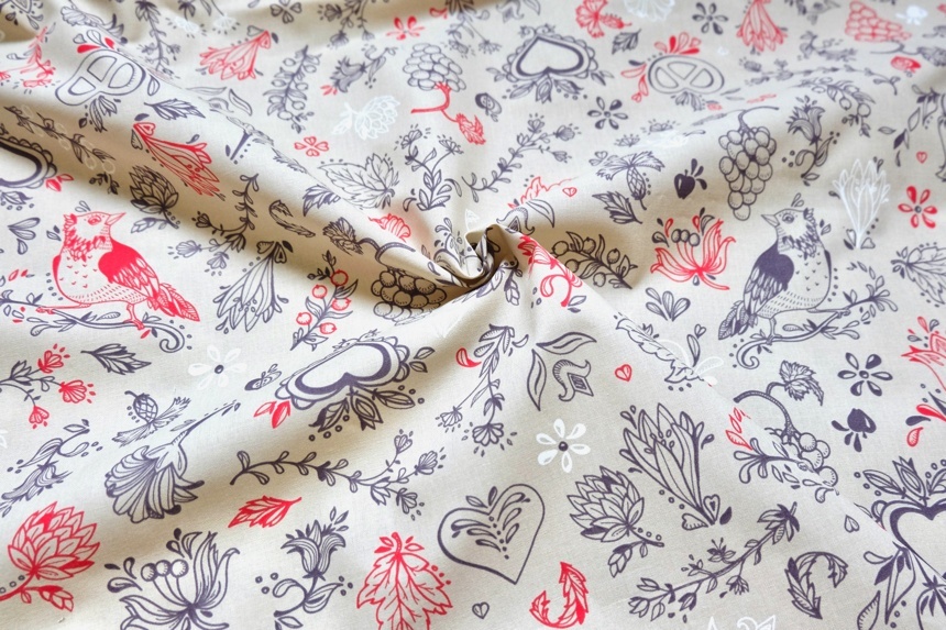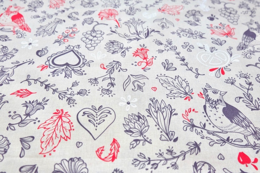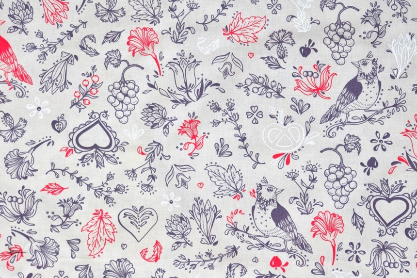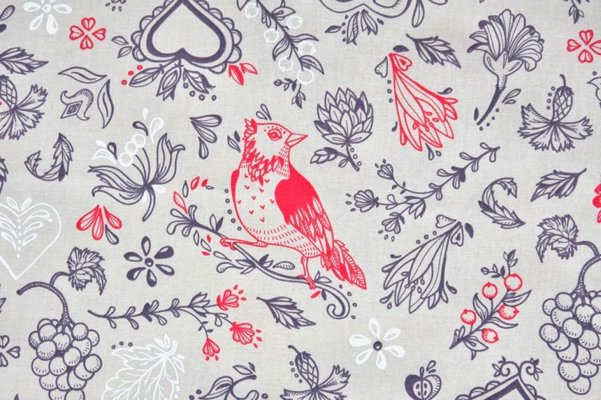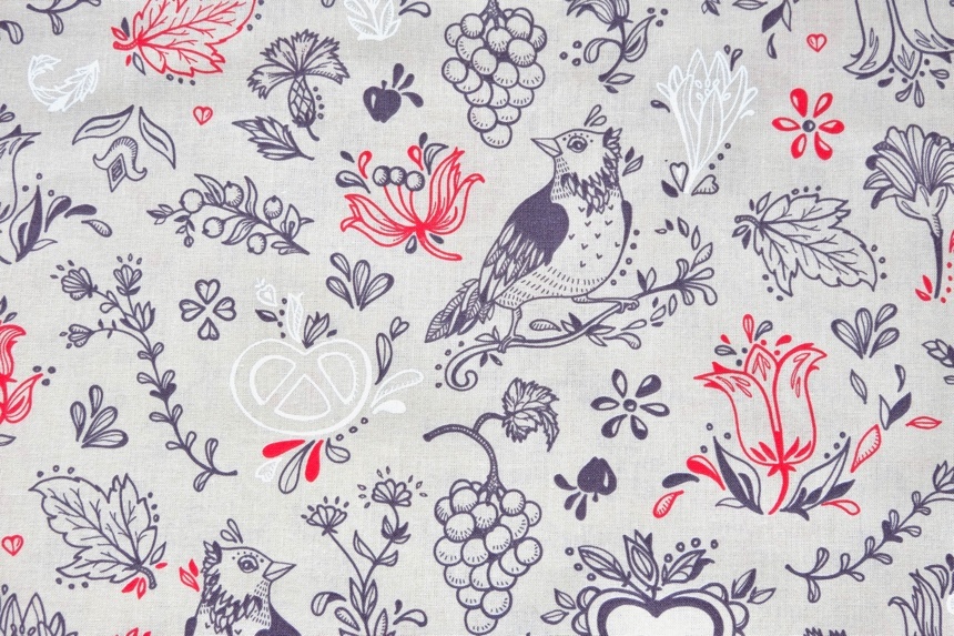 ベージュベースに赤やグレイで花、鶏、プレッツェル、ぶどうなど