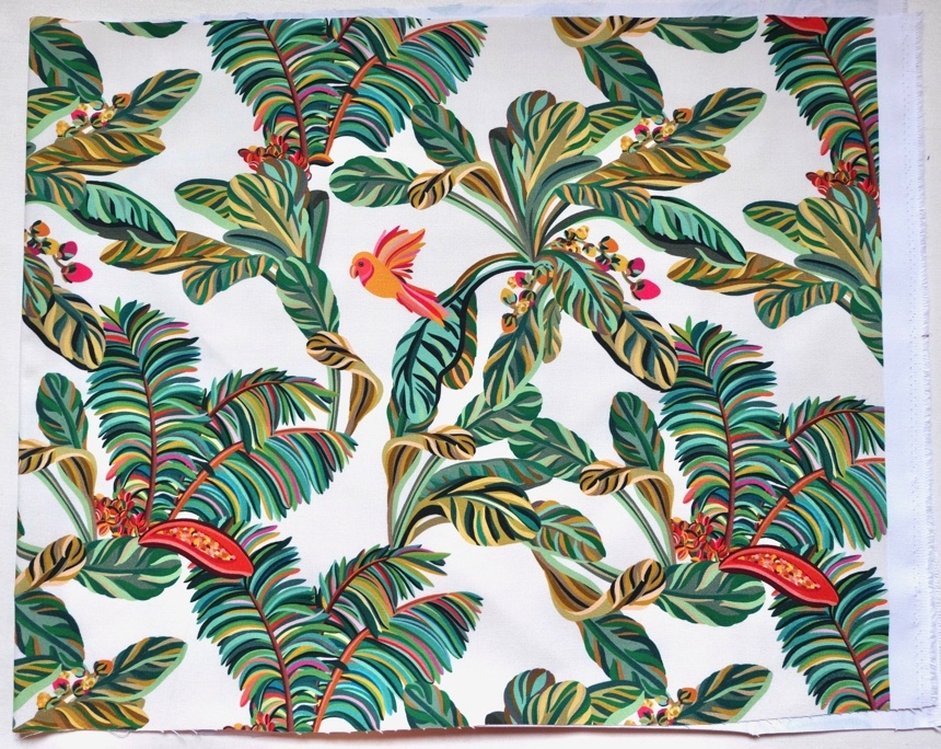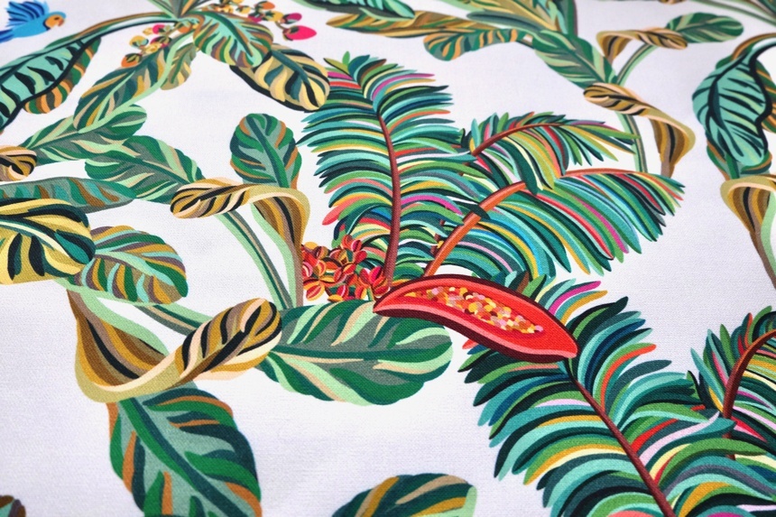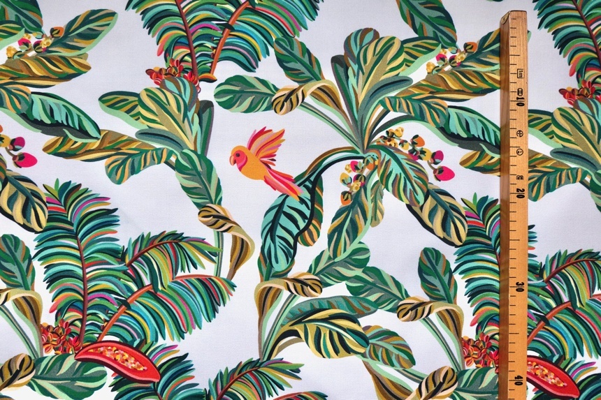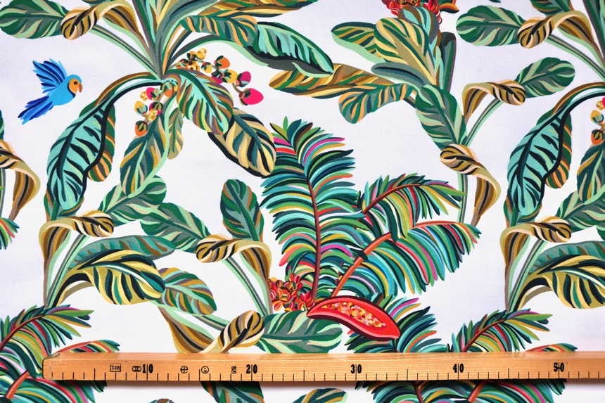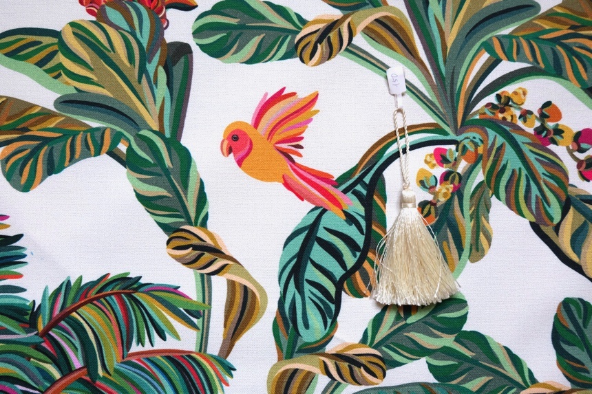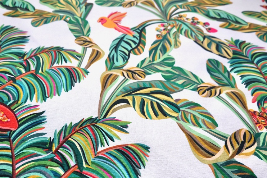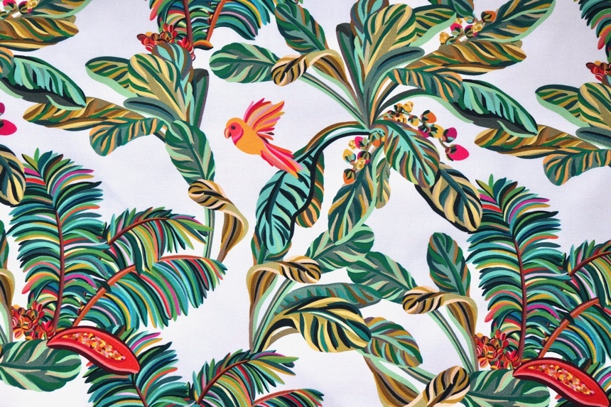 白ベースにグリーンなどの色でトロピカルな植物や鳥がデザインされています。