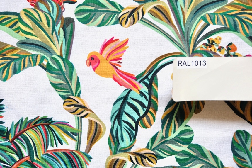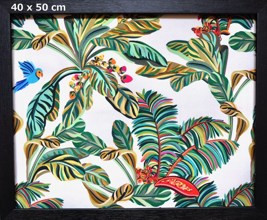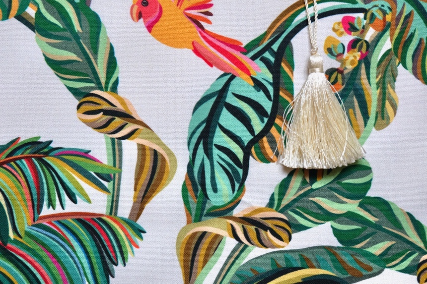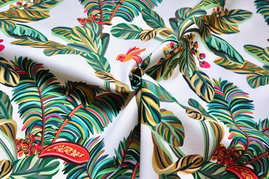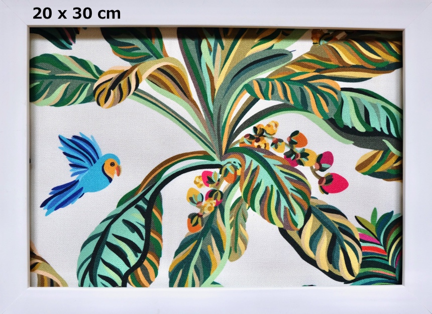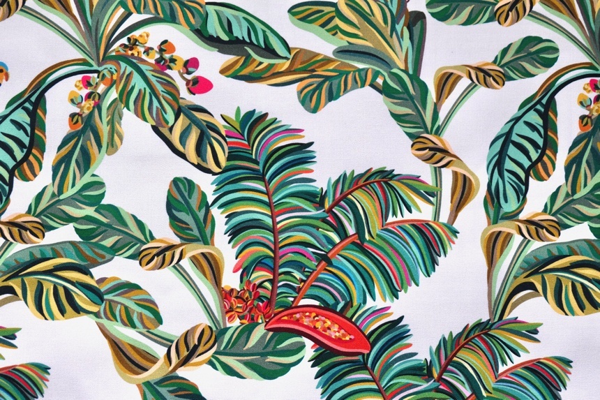 白ベースにグリーンなどの色でトロピカルな植物や鳥がデザインされています。