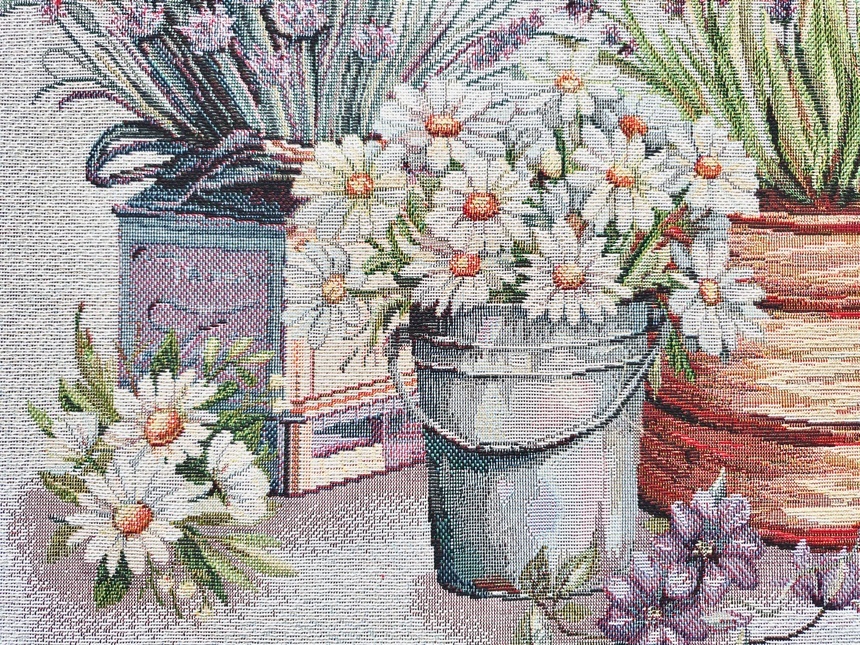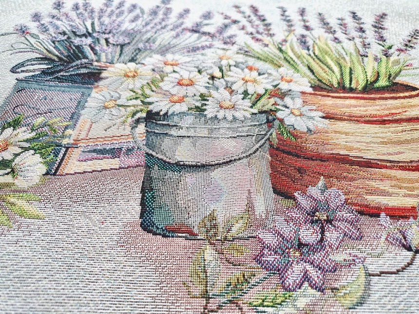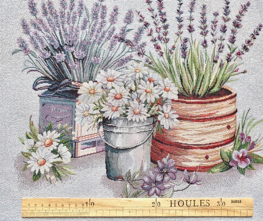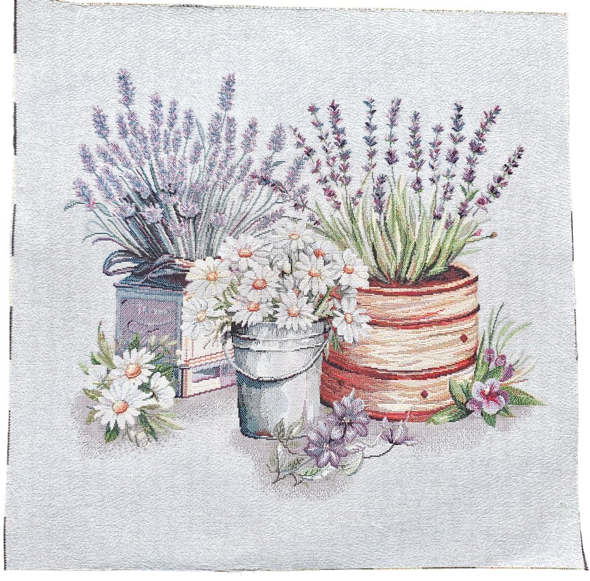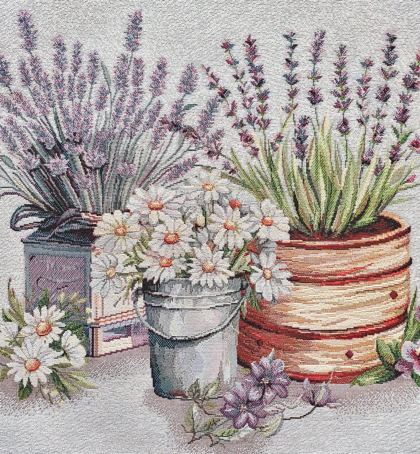 - > 「移動中」はぎれ45×45:ラベンダー鉢とマーガレット